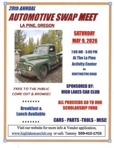 Join us on Saturday, May 9, 2026 for our 20th Annual Automotive Swap Meet sponsored by the High Lakes Car Club. This years event will take place at the La Pine (Senior) Activity Center located on the corner of Huntington Road and Victory Way in La Pine, Oregon. Cars, parts, tools, food, crafts and more! Free admission to the public.